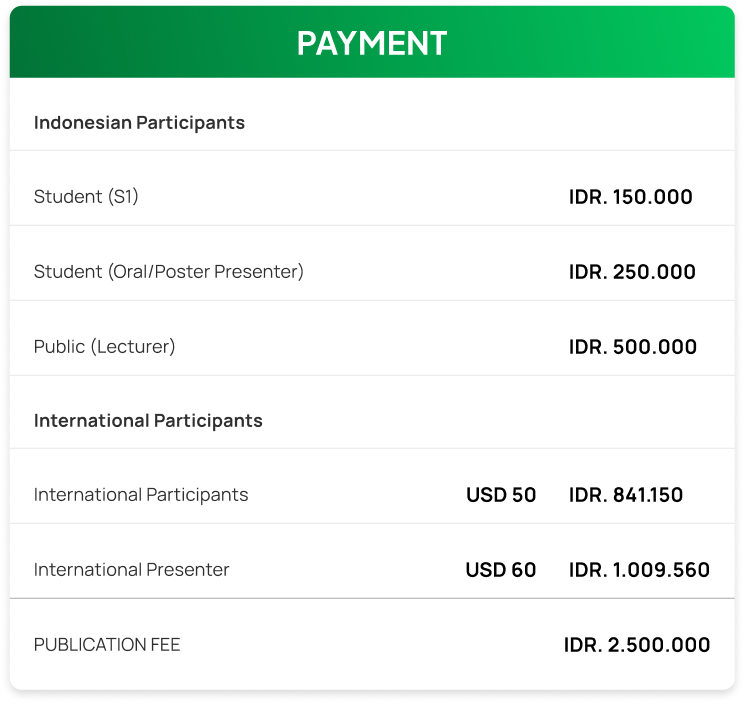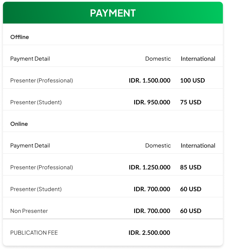 Payment Payment Payment Information Participants may complete the registration fee payment via bank transfer to the following account:Bank Name:Bank BTNVA Account Number:94220-023-066-08-0006VA Account Name:Unesa Conference FK More Information Instagram @icbish.unesa Tiktok @fk_unesa YouTube @FKUNESA Gmail icbish@unesa.ac.id